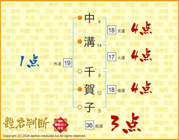 中(4画)溝(14画) 千(3画)賀(12画)子(3画)