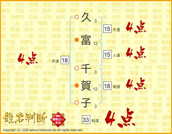 久(3画)富(12画) 千(3画)賀(12画)子(3画)