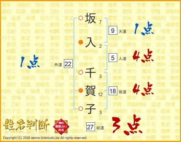坂(7画)入(2画) 千(3画)賀(12画)子(3画)