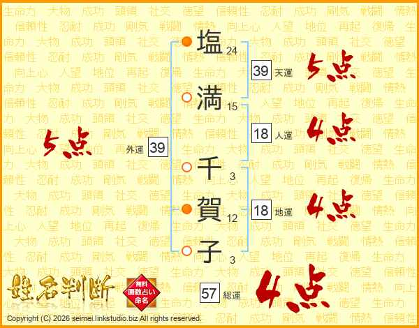 塩(24画)満(15画) 千(3画)賀(12画)子(3画)