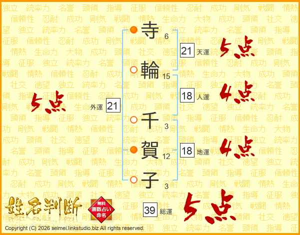 寺輪千賀子さんの総運は39画の5点!