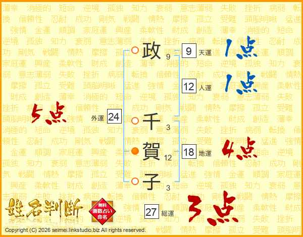 政(9画) 千(3画)賀(12画)子(3画)