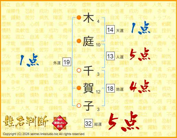 木(4画)庭(10画) 千(3画)賀(12画)子(3画)