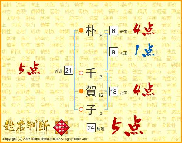 生活面を象徴する運勢です。外部から受ける影響力を表し、結婚運、家庭運や職場、環境への順応性を表します。総運から人運を引いた画数。姓や名が1文字の場合を除く。