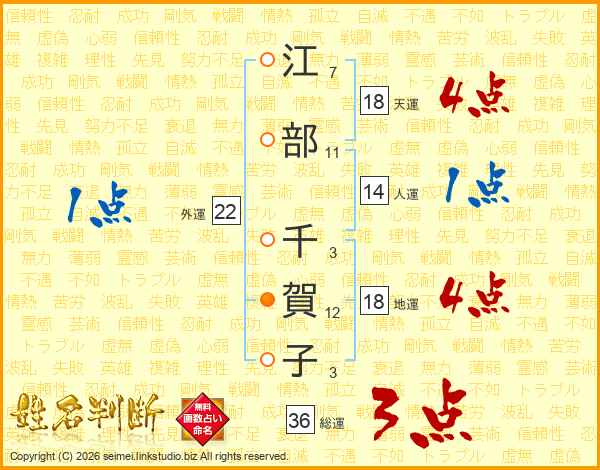 江(7画)部(11画) 千(3画)賀(12画)子(3画)