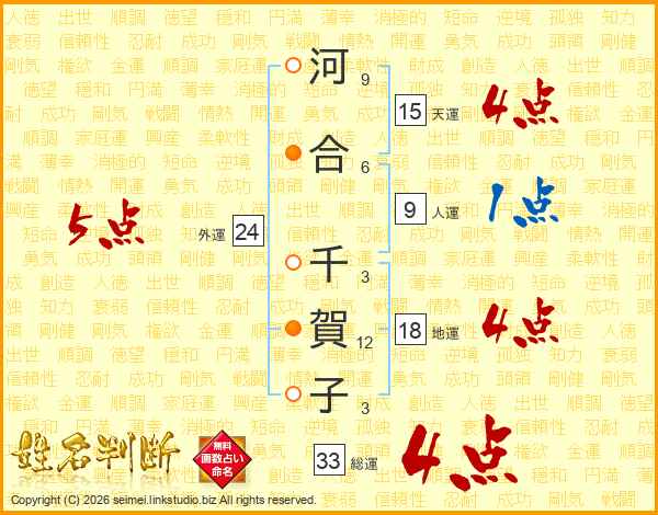 河(9画)合(6画) 千(3画)賀(12画)子(3画)