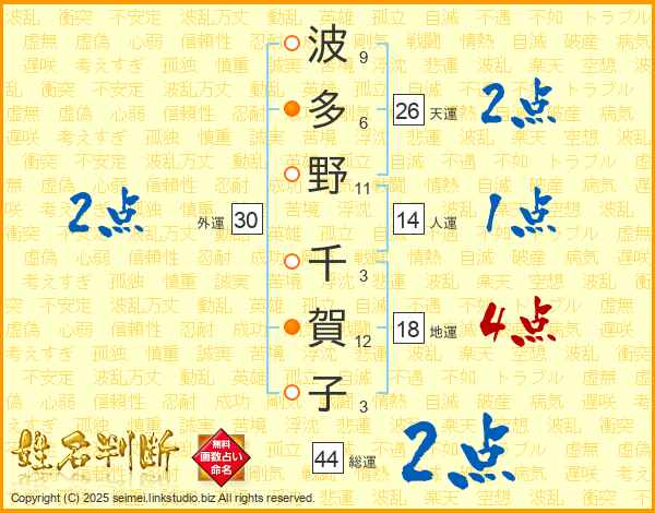 波(9画)多(6画)野(11画) 千(3画)賀(12画)子(3画)
