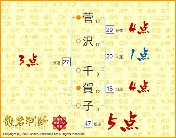 菅(12画)沢(17画) 千(3画)賀(12画)子(3画)