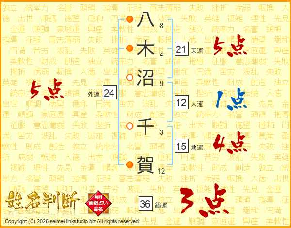 八木沼千賀さんの天運は21画の5点!