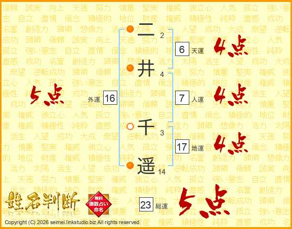 生活面を象徴する運勢です。外部から受ける影響力を表し、結婚運、家庭運や職場、環境への順応性を表します。総運から人運を引いた画数。姓や名が1文字の場合を除く。
