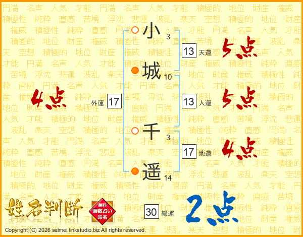 生活面を象徴する運勢です。外部から受ける影響力を表し、結婚運、家庭運や職場、環境への順応性を表します。総運から人運を引いた画数。姓や名が1文字の場合を除く。