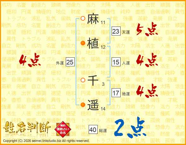 生活面を象徴する運勢です。外部から受ける影響力を表し、結婚運、家庭運や職場、環境への順応性を表します。総運から人運を引いた画数。姓や名が1文字の場合を除く。