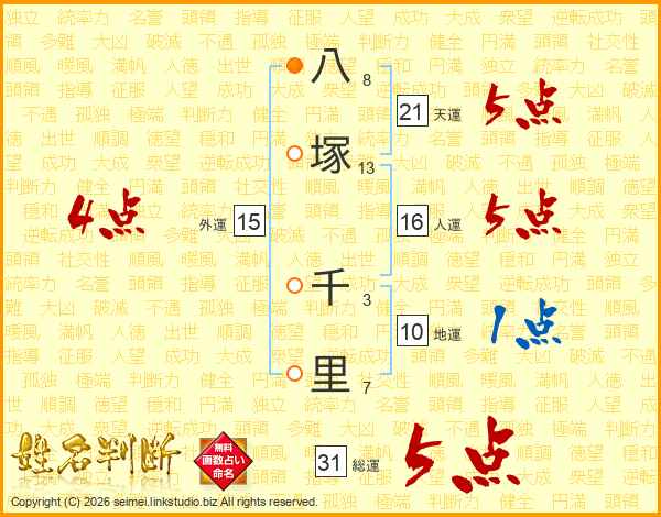 あなたの人生を表す1番重要な運勢です。生涯を通じて影響する総合運となり、主に50歳以降の晩年期に影響を及ぼします。苗字と名前の合計画数。