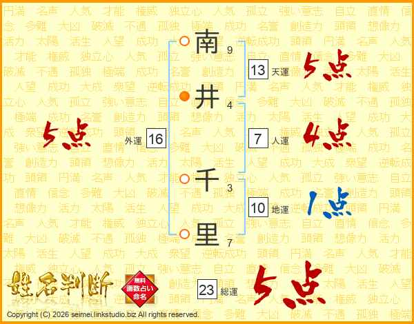 生活面を象徴する運勢です。外部から受ける影響力を表し、結婚運、家庭運や職場、環境への順応性を表します。総運から人運を引いた画数。姓や名が1文字の場合を除く。