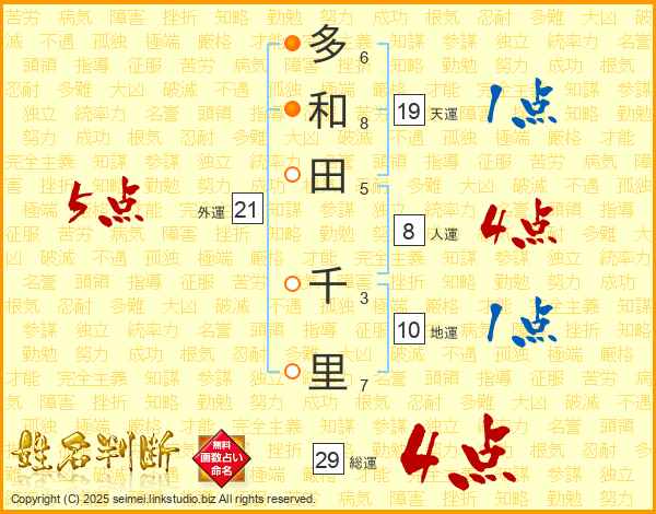 生活面を象徴する運勢です。外部から受ける影響力を表し、結婚運、家庭運や職場、環境への順応性を表します。総運から人運を引いた画数。姓や名が1文字の場合を除く。