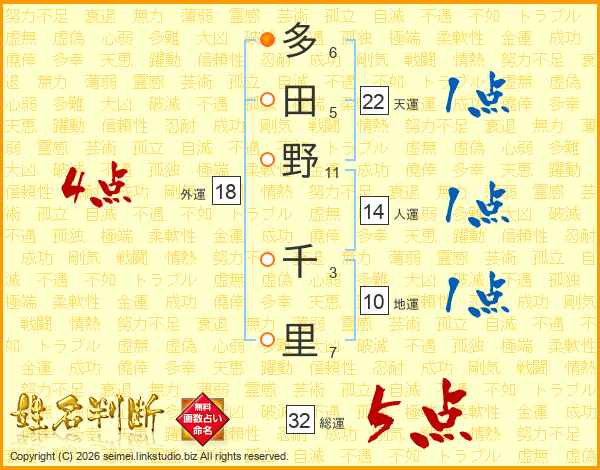 多(6画)田(5画)野(11画) 千(3画)里(7画)