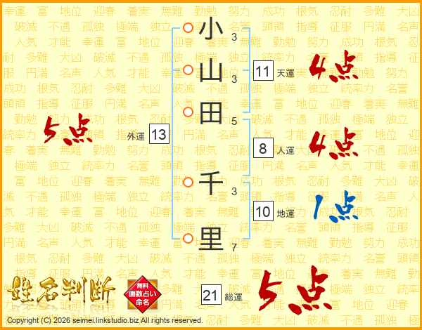 小山田千里さんの総運は21画の5点!