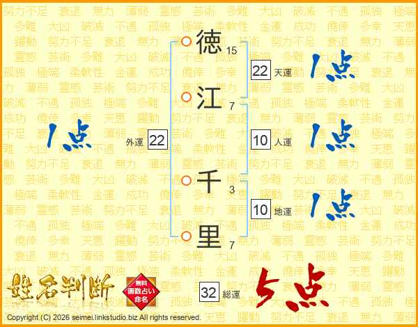 生活面を象徴する運勢です。外部から受ける影響力を表し、結婚運、家庭運や職場、環境への順応性を表します。総運から人運を引いた画数。姓や名が1文字の場合を除く。