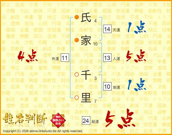 生活面を象徴する運勢です。外部から受ける影響力を表し、結婚運、家庭運や職場、環境への順応性を表します。総運から人運を引いた画数。姓や名が1文字の場合を除く。