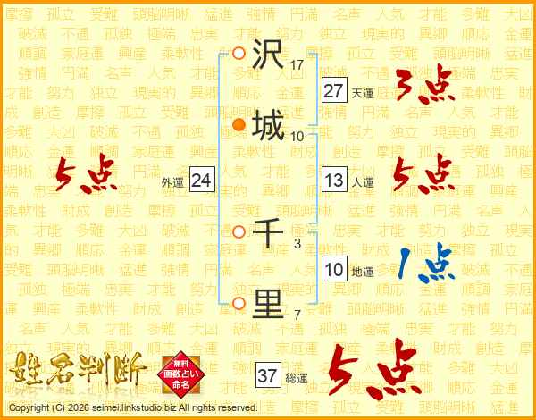 生活面を象徴する運勢です。外部から受ける影響力を表し、結婚運、家庭運や職場、環境への順応性を表します。総運から人運を引いた画数。姓や名が1文字の場合を除く。