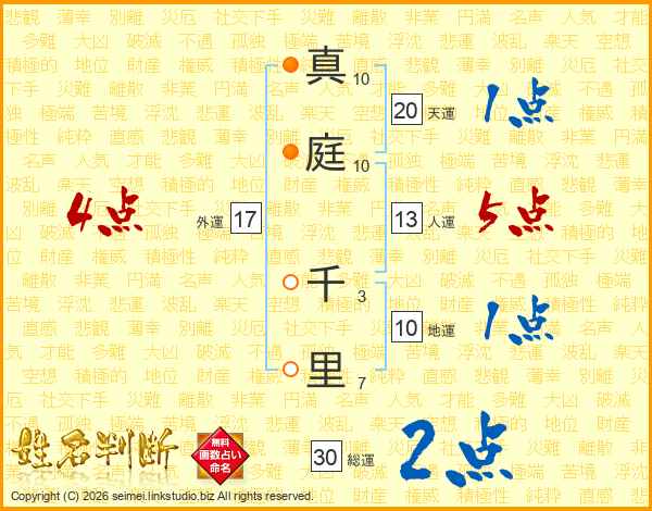 生活面を象徴する運勢です。外部から受ける影響力を表し、結婚運、家庭運や職場、環境への順応性を表します。総運から人運を引いた画数。姓や名が1文字の場合を除く。