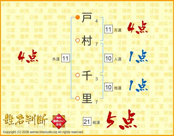 生活面を象徴する運勢です。外部から受ける影響力を表し、結婚運、家庭運や職場、環境への順応性を表します。総運から人運を引いた画数。姓や名が1文字の場合を除く。