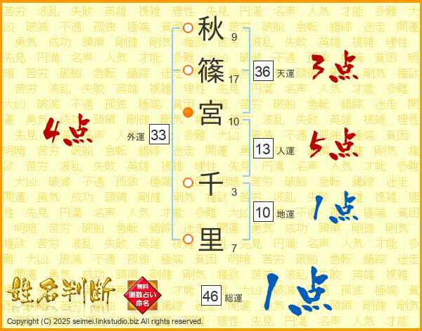 秋(9画)篠(17画)宮(10画) 千(3画)里(7画)