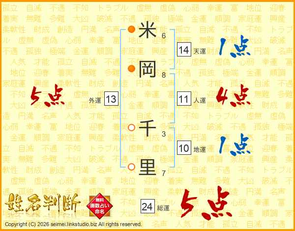 生活面を象徴する運勢です。外部から受ける影響力を表し、結婚運、家庭運や職場、環境への順応性を表します。総運から人運を引いた画数。姓や名が1文字の場合を除く。