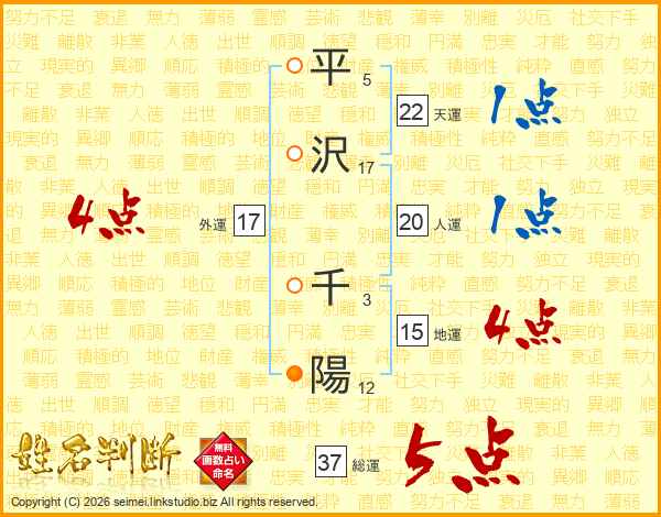 平(5画)沢(17画) 千(3画)陽(12画)