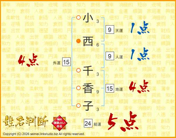 小(3画)西(6画) 千(3画)香(9画)子(3画)