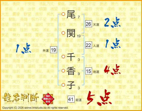 尾(7画)関(19画) 千(3画)香(9画)子(3画)