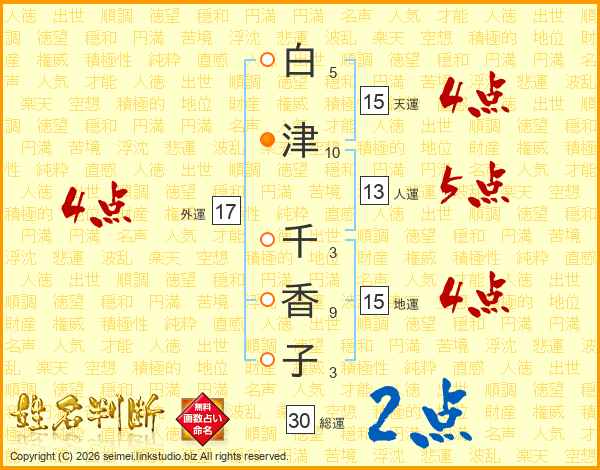 白(5画)津(10画) 千(3画)香(9画)子(3画)