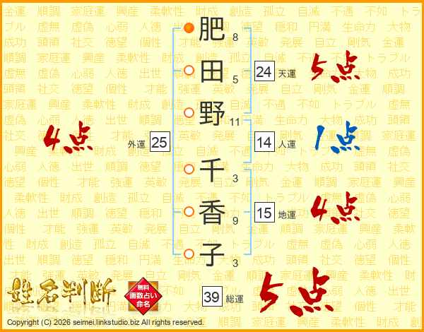 肥(8画)田(5画)野(11画) 千(3画)香(9画)子(3画)