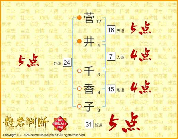 菅(12画)井(4画) 千(3画)香(9画)子(3画)