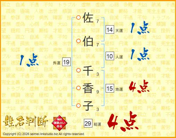 佐(7画)伯(7画) 千(3画)香(9画)子(3画)