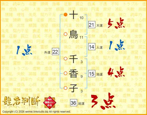 十(10画)鳥(11画) 千(3画)香(9画)子(3画)