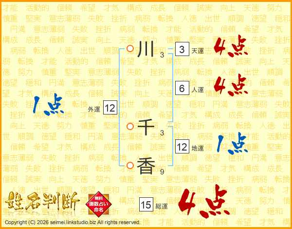 川(3画) 千(3画)香(9画)