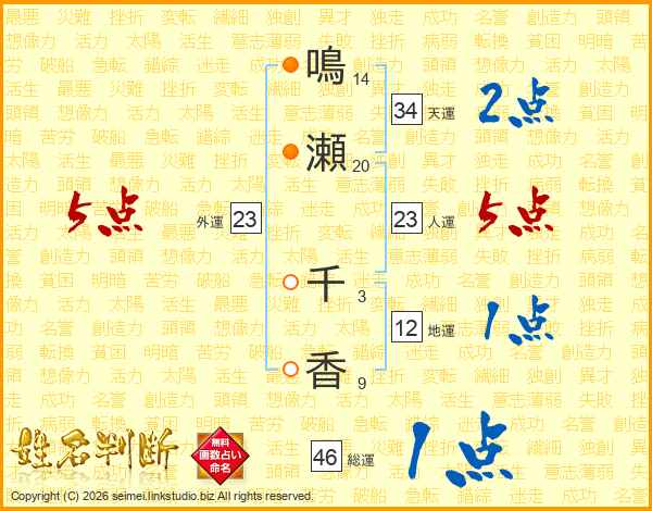 鳴(14画)瀬(20画) 千(3画)香(9画)