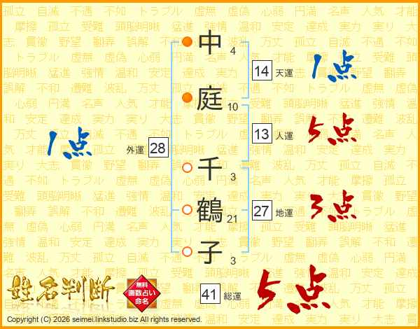 中(4画)庭(10画) 千(3画)鶴(21画)子(3画)
