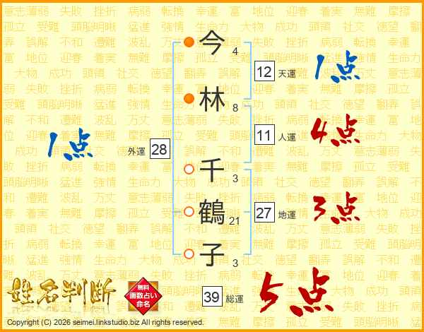 今林千鶴子さんの総運は39画の5点!