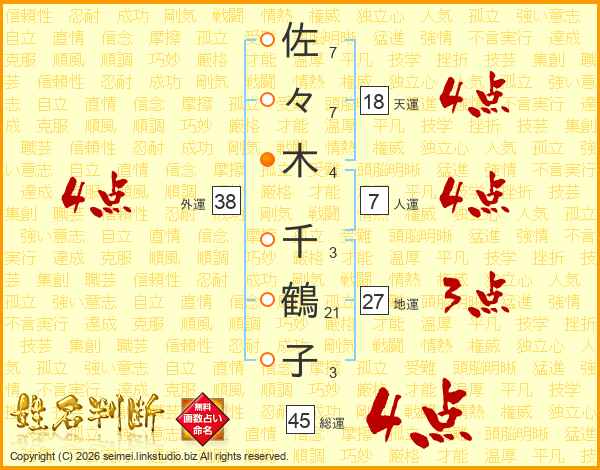 佐(7画)々(7画)木(4画) 千(3画)鶴(21画)子(3画)