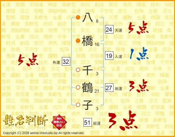 八橋千鶴子さんの外運は32画の5点!