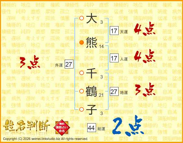 大(3画)熊(14画) 千(3画)鶴(21画)子(3画)