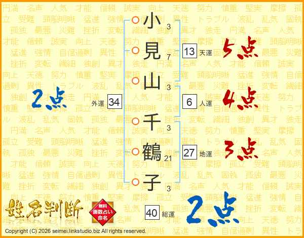 小(3画)見(7画)山(3画) 千(3画)鶴(21画)子(3画)