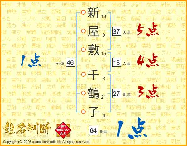 新(13画)屋(9画)敷(15画) 千(3画)鶴(21画)子(3画)