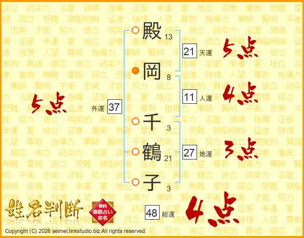 殿(13画)岡(8画) 千(3画)鶴(21画)子(3画)