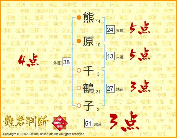 熊(14画)原(10画) 千(3画)鶴(21画)子(3画)