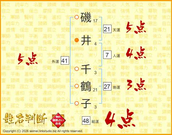 磯(17画)井(4画) 千(3画)鶴(21画)子(3画)