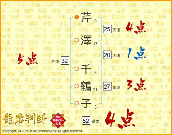 芹(8画)澤(17画) 千(3画)鶴(21画)子(3画)