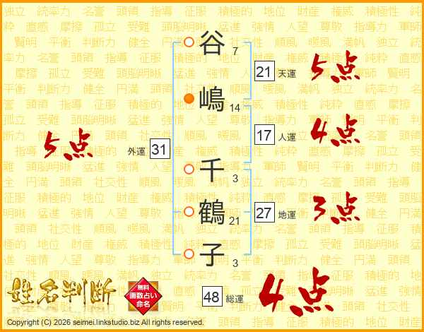 谷(7画)嶋(14画) 千(3画)鶴(21画)子(3画)